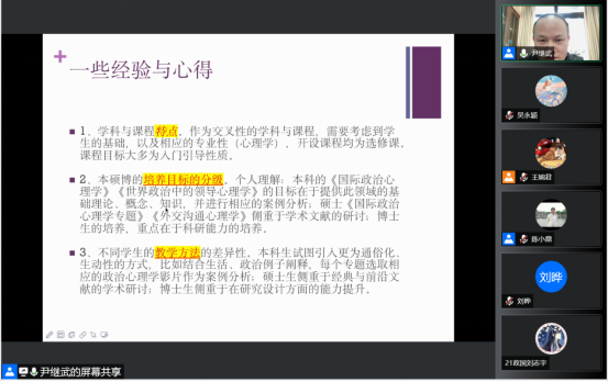 随后尹继武老师分享了自己在国际政治心理学课程大纲设计。尹继武老师针对本科、硕士、博士不同年级,设置了相对应的课程大纲,让不同层级的同学得到不同程度的训练。同时尹继武老师对国际政治心理学课程设计以及教学方法,进行了反思。