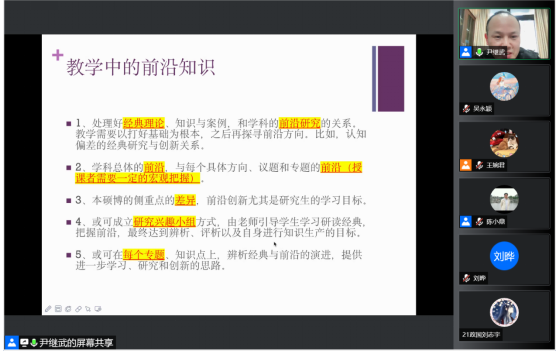 讲座伊始,尹继武老师简单介绍了自己关于对国际政治心理学的理解认识以及课程的教学经验,并介绍了国际政治心理学国内国际相关的教学教材。随后尹继武教授从学科与课程特点、本硕博培养目标的分级、不同学生教学方法的差异性、教学方法的差异性、本硕博的训练机制差异性设置等10个方面分享了自己在国际政治心理学课程教学方面的经验与心得。