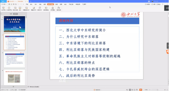 本次讲座分为八个部分。首先,韩教授简要介绍了西北大学中东研究所的发展历程和科研实力。然后,围绕讲座主题,韩教授先扼要阐述了研究中东部落的原因,然后介绍了瓦法拉部落、卡达法部落、萨阿迪部落、瓦利德部落等多个在利比亚有重大影响的部落,并认为中东语境下的部落与我们印象中的部落不同。韩教授指出,中东地区的部落泛指家庭之上各个层面的地方性社会组织,是家庭的扩大形式,也是社会荣誉与地位的象征与来源。