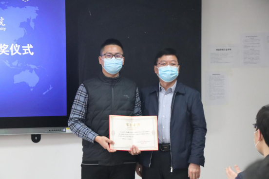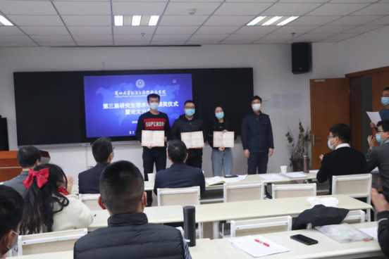 第三届研究生学术年会”获奖名单,评审专家组为获得优秀奖的曹佳鲁、张少文、罗金、史旭潇和祁梦丹等同学颁奖,副院长曾向红教授为获得三等奖的李嘉伟、杨鹏飞和赵柳希三位同学颁奖,院长汪金国教授为获得二等奖尉锦菠和李兴基两位同学颁奖,党委书记姚志海为获得一等奖的赵磊同学颁奖。