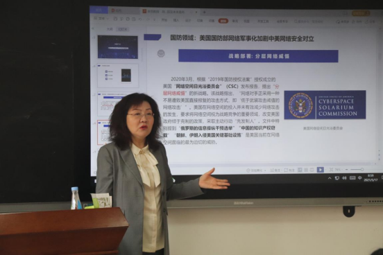 余老师主要从中美网络空间战略博弈态势、中美网络空间战略对冲的动因、中美网络空间战略博弈的走向、美国对华网络空间战略的中国应对等方面与师生们进行探讨深入交流。