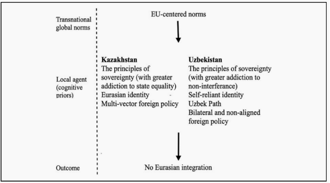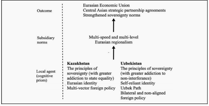 中亚领导人的不同理念造就了各国不同的道路、身份与内外政策。通过宣传欧亚地区主义的理念,哈萨克斯坦旨在强化其认知优先:国家平等、欧亚认同和多元外交政策。有人认为,哈萨克斯坦地区主义项目的失败都可能引发其身份分裂和领土分离,破坏政治精英的信仰和策略。为了避免这种情况,哈萨克斯坦一贯主张推进与中亚邻国及俄罗斯的一体化。