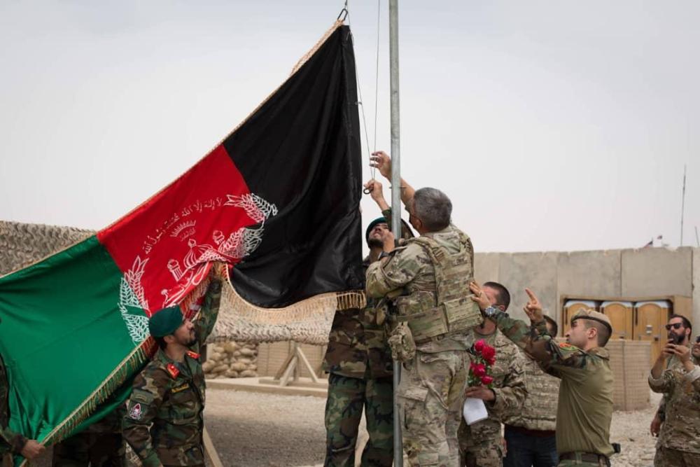 5月2日,阿富汗士兵与美军士兵在阿富汗赫尔曼德省一处军事基地升起阿富汗国旗。当日,美军向阿富汗国民军移交这处军事基地。新华社发(阿富汗国防部供图)