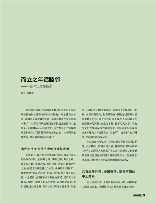 “而立之年话睦邻——中国与土库曼斯坦”全文如下: