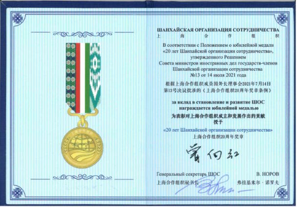 根据上海合作组织成员国外长理事会2021年7月14日第13号决议批准的《上海合作组织20周年奖章条例》,上海合作组织秘书长弗拉基米尔·诺罗夫代表上海合作组织授予色情小说网