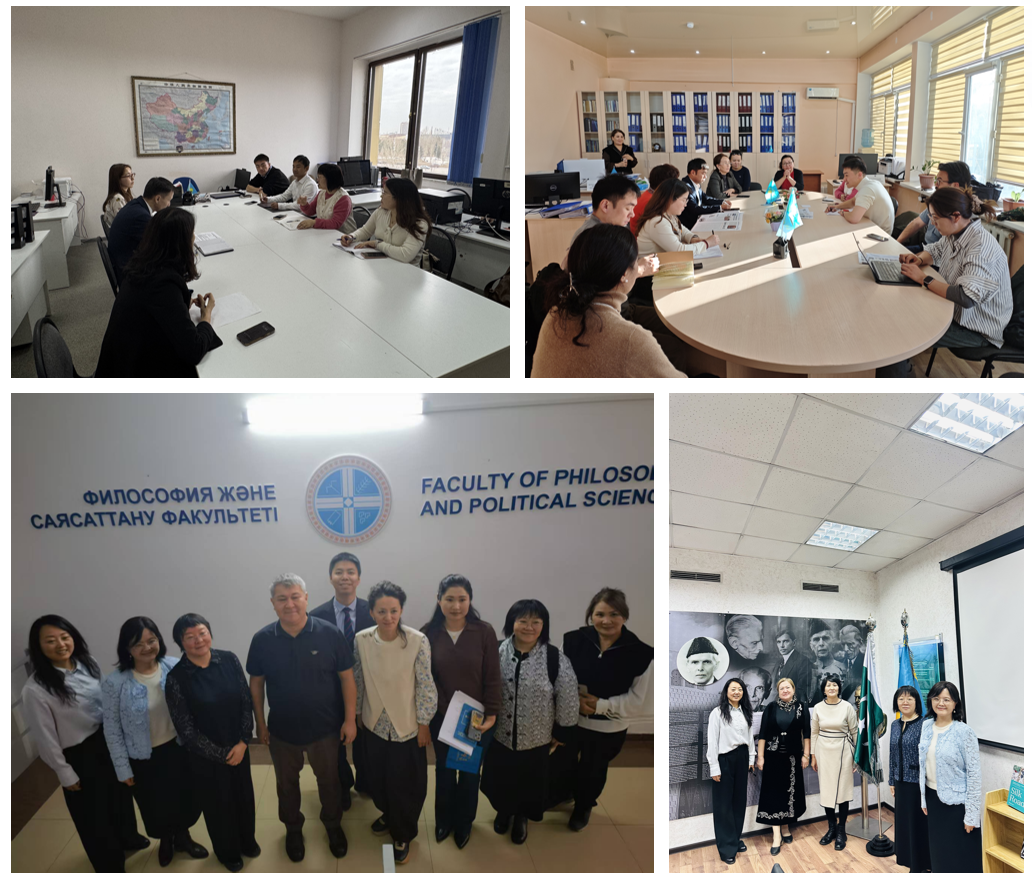 为夯实合作基础,研修团拜访了阿里·法拉比哈萨克国立大学国际关系学院、法学院、哲学与政治科学学院、东方学学院,研究团还前往哈萨克斯坦国立女子师范大学、哈萨克斯坦阿布莱汗国际关系与世界语言大学、北京语言大学哈萨克斯坦分校、古米廖夫欧亚国立大学汉语言文学教研室等高校与科研机构,与相关负责人进行了工作洽谈,在学生互派、学者互访、联合培养、暑期学校、双学位项目、国际会议联办等方面达成初步合作共识。
