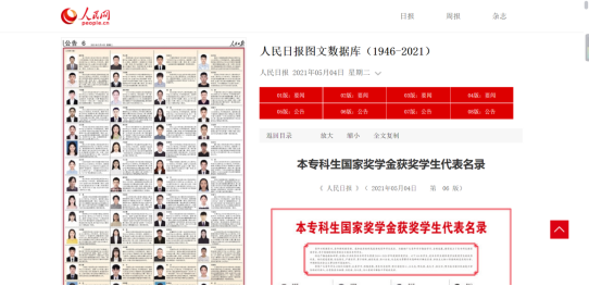 2021年5月4日,《人民日报》专版刊登《本专科生国家奖学金获奖学生代表名录》,展示100名优秀代表的风采。我有幸成为甘肃院校获奖学生代表而被“点名”,属实意外与惊喜。
