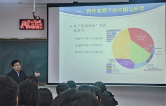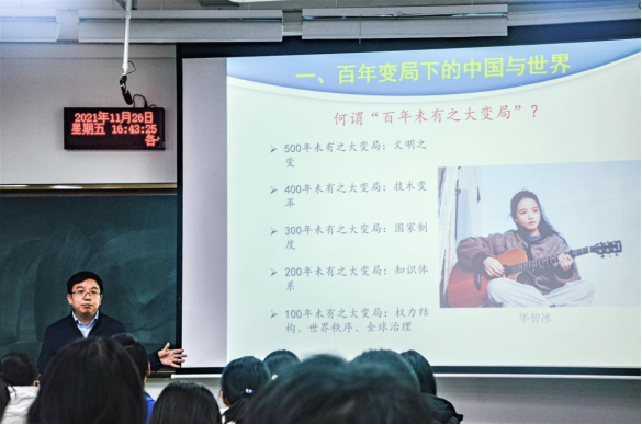 曹伟老师说:“近一百年来,特别是改革开放四十年来,中国的社会面貌发生了天翻地覆的变化。今天我们正处在百年未有之大变局下,这对于世界和中国都有着巨大影响。”随后,曹伟老师带领同学们回顾了“百年变局”这一概念提出的历程及其深刻含义。他指出,我们不仅要看到近一百年的变化,还要往前看,世界经历了文明之变、技术之变、制度之变、知识系统之变等诸多变革后发生的重大变化。中国在近百年来经历了站起来、富起来到强起来的历程。在这一过程中,中国始终坚持走自己的路,在不断摸索下走出了一条不同于西方的建设现代化强国之路。