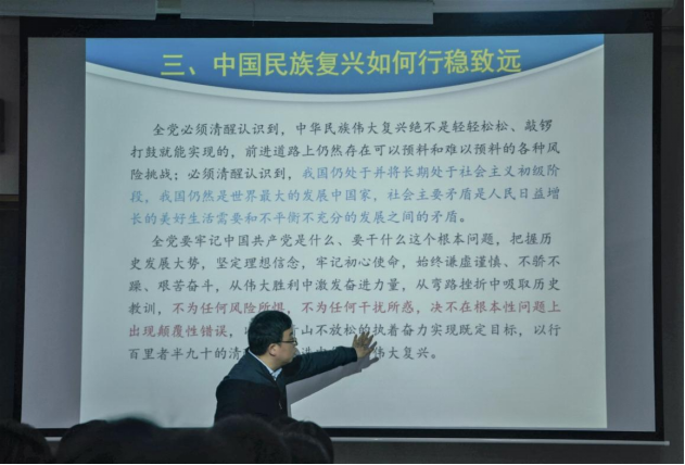 首先,曹伟老师询问在座同学对十九届六中全会决议的心得,他说:“三万九千多字的决议内容丰富,同学们若能通读并理解,必然会有所裨益”。接着曹伟老师分别从“百年变局下的中国与世界”“中美关系与世界秩序变迁”“中国民族复兴如何行稳致远”三个方面带领同学们深度体悟十九届六中全会精神。