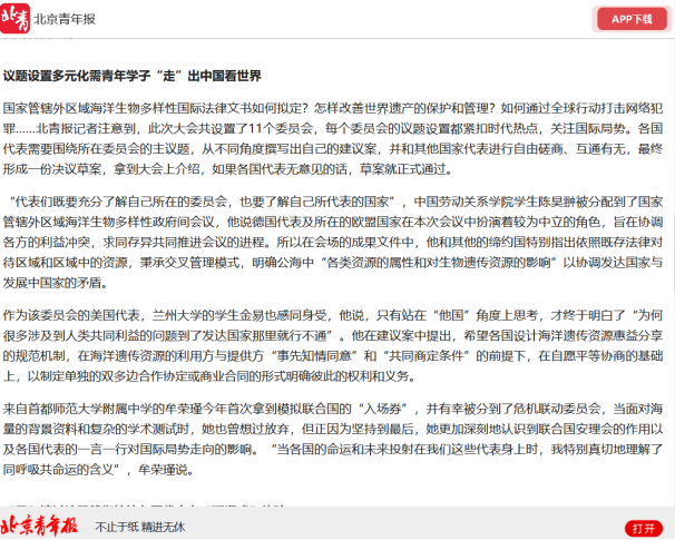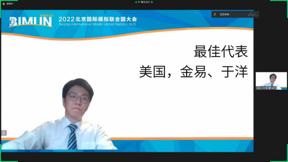 在中文会场:国家管辖范围以外区域海洋生物多样性政府间会议(BBCJ-IGC)。代表美国的我校学子金易、于洋两位同学积极参与磋商和文件写作,穿梭于各个国家利益集团开展多边外交,以出色的会场发言,严谨的学术态度和高水平的文件写作,获得了该委员会的最高奖项“最佳代表”(Best Delegate)。会后,金易同学还作为会场代表接受了北京青年报的采访。