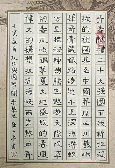 于2022年9月30日至10月11日举办了“喜迎二十大”系列活动——书法创作、海报设计比赛。本次共有10名同学获奖,让我们来看看他们的作品吧!