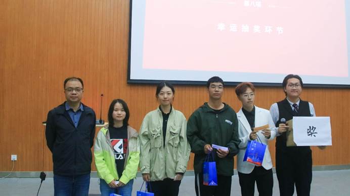 大会第三项,播放新生投稿最美家乡展图片视频集锦,并进行抽奖活动,这一环节将本次大会推向高潮。在大会开始前,每位新生的位置上都被放上了一封由高年级学长学姐们亲笔书写的新生寄语,以及一张任意颜色的纸条,在大会上的抽奖环节上,由学院党委书记常虹老师与院长汪金国教授在纸箱共同抽取带有颜色的纸条,与放置于新生信封中的纸条相对应,纸条颜色一致的同学即为获奖,并由学院副院长陈小鼎教授为四位获奖同学颁发学院精美礼品一份。