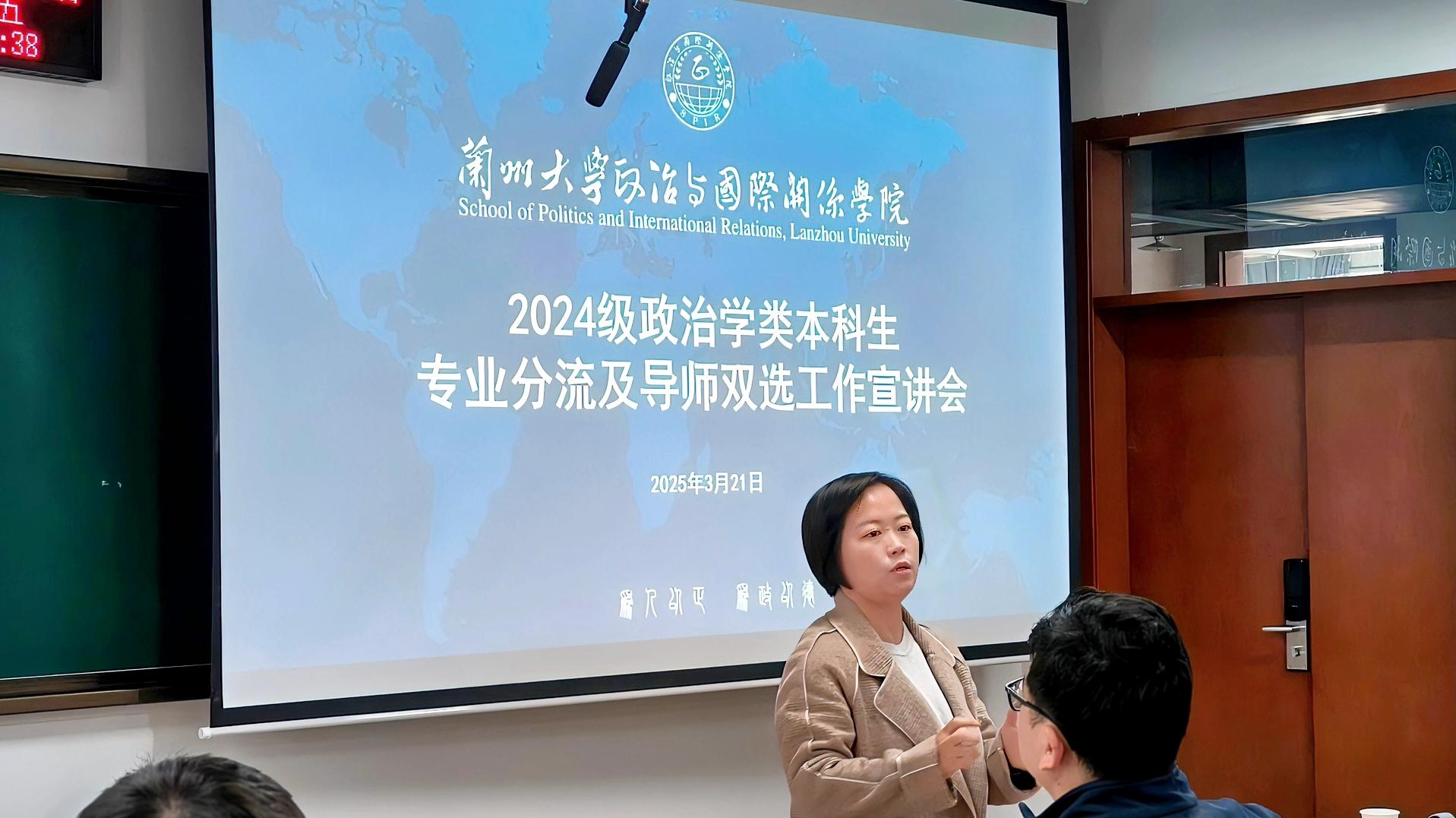 于秦岭堂B402召开2024级政治学类本科生专业分流及导师双选宣讲会。本次会议通过“专业认知-学术导航-成长规划”三维指导体系,立体化呈现学院人才培养路径,副院长高婉妮、各系主任、教师代表及全体2024级本科生参会。