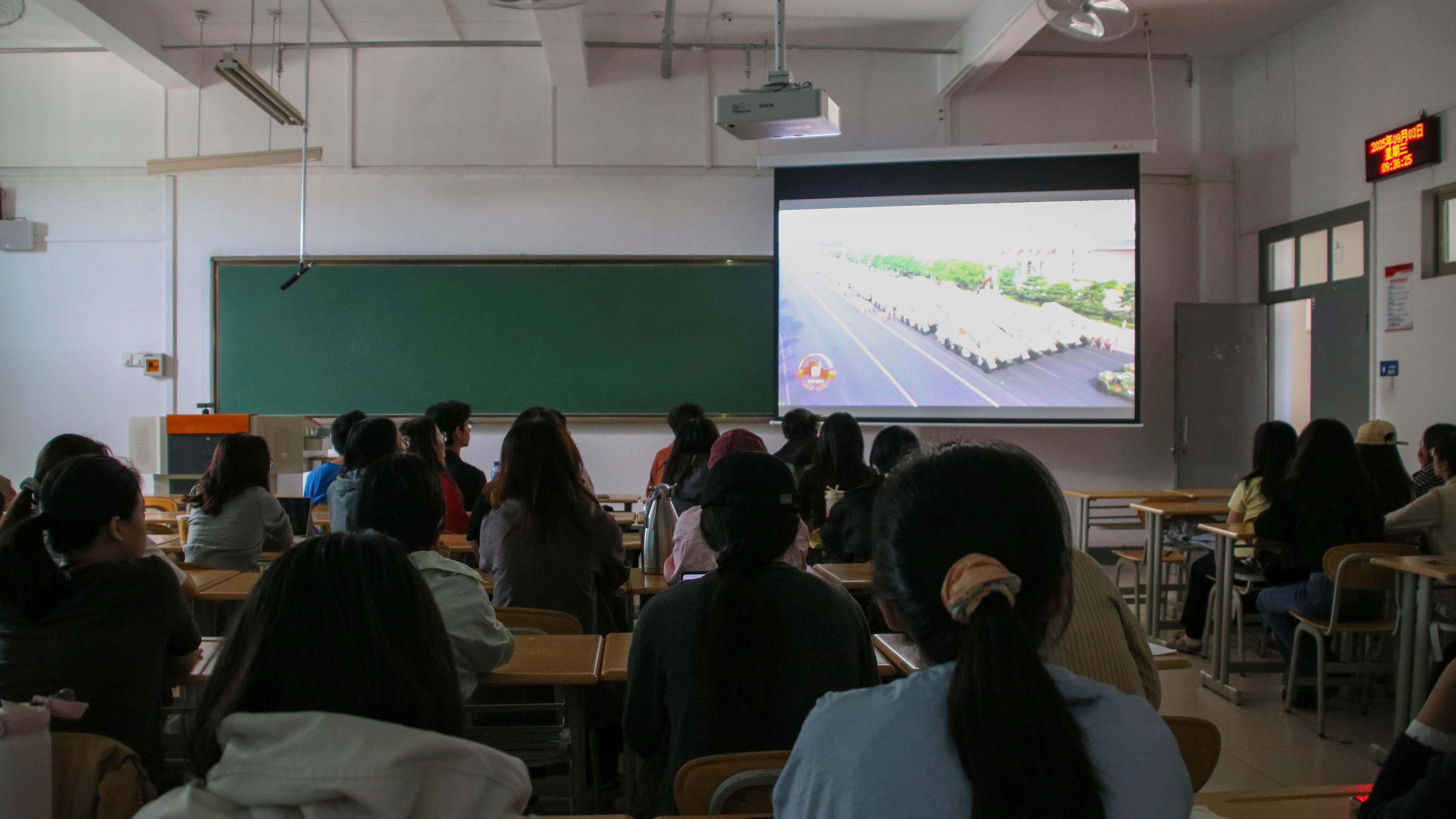 上午9时,阅兵仪式正式开始。学院会议室内气氛庄重热烈,师生们全神贯注,紧盯屏幕。受阅部队整齐划一的步伐、威武雄壮的气势、先进精良的装备,依次通过天安门广场接受检阅,充分展现新时代国防和军队建设的辉煌成就,彰显国家主权、安全和发展利益的坚强保障。观看过程中,现场多次爆发出热烈而持久的掌声,师生们的民族自豪感和爱国热情高涨。