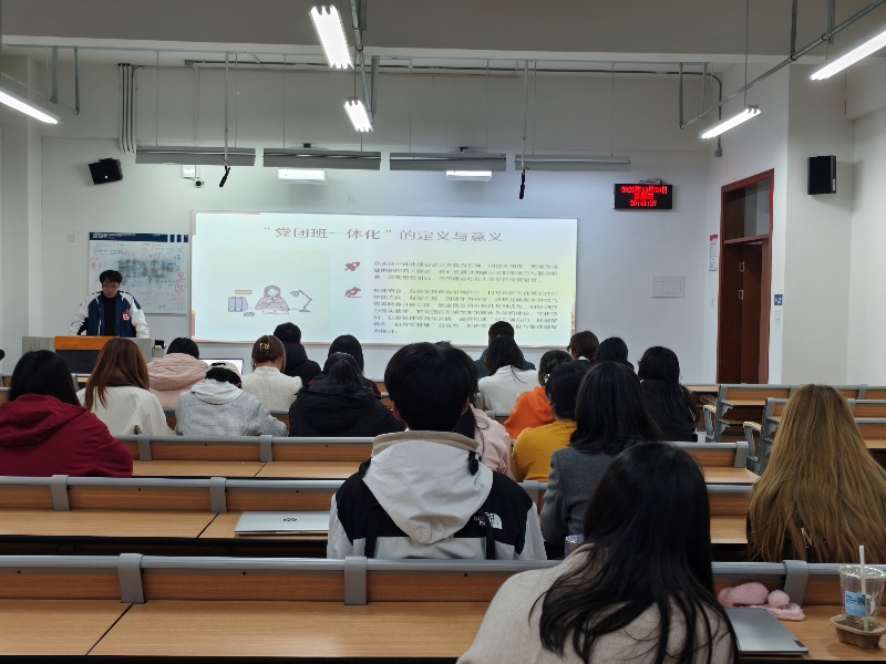 活动围绕“党团班一体化的定义与意义”“聚焦党的最新理论成果”“党建、团建与班级建设协同机制”以及“凝聚共识、共谋发展”四个核心板块展开。班长范宸豪从组织定位入手,系统阐释了“党组织作为大脑与核心、团组织作为桥梁与纽带、班级作为基础与阵地”的一体化运行逻辑,强调要以党组织为引领、团组织为传导、班级为落实,形成上下贯通、协同推进的组织格局。