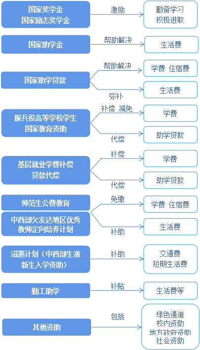国家在高等教育本专科阶段建立起国家奖学金、国家励志奖学金、国家助学金、国家助学贷款等多种形式有机结合的高校学生资助政策体系。