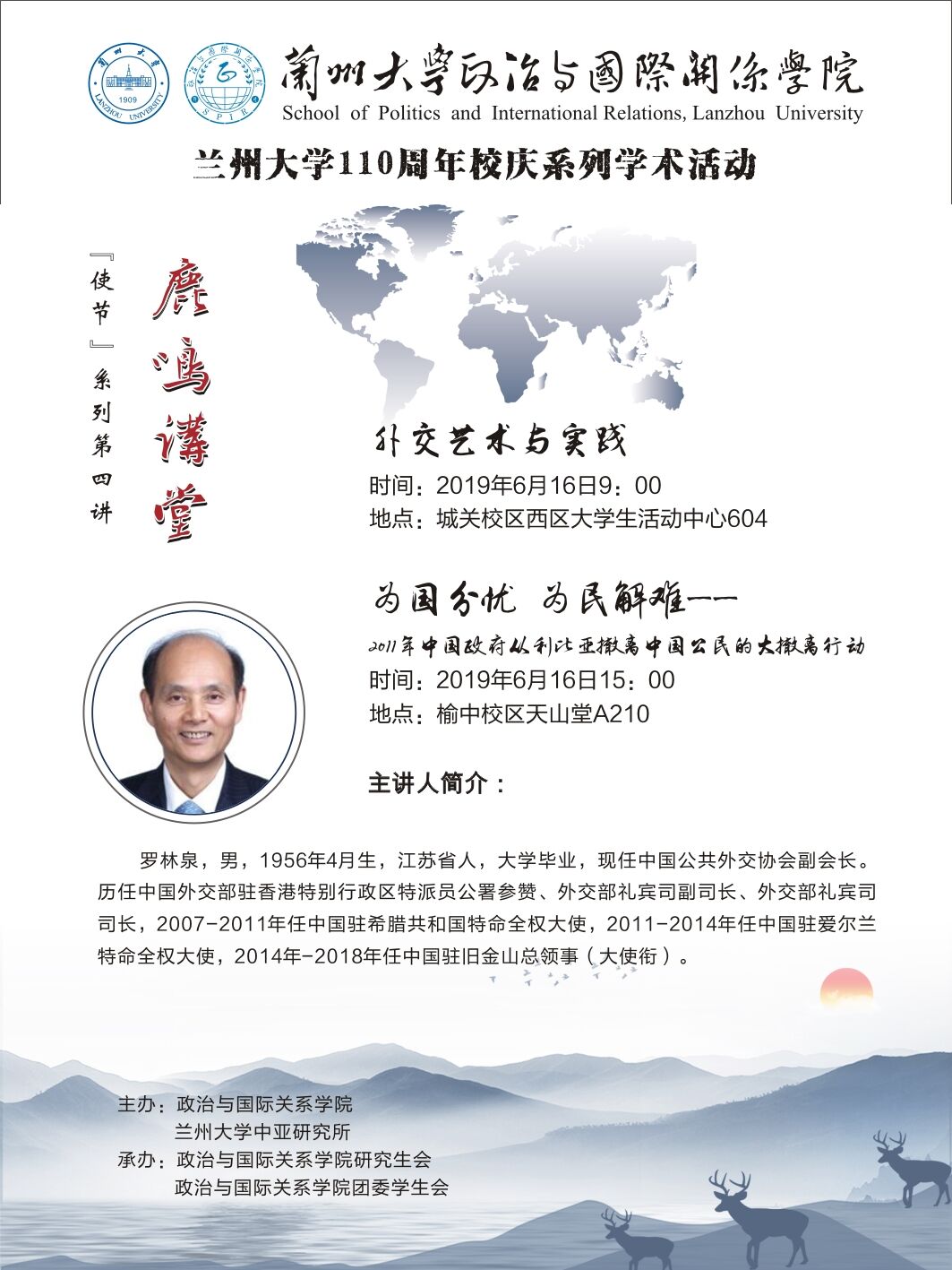 Invited by the School of Politics and International Relations of Lanzhou University, Luo Lingquan,the vice-president of China Public Diplomacy Association and Former Consul General of the People's Republic of China in San Francisco, U.S.A., will hold an academic lecture in our School on June 16th, 2019. All the teachers and students are welcome to attend.