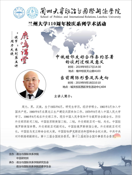 Invited by the School of Politics and International Relations of Lanzhou University, Zhou Li,former Chinese Ambassador to Kazakhstan, former Vice Minister of the International Department of the CPC Central Committee, will hold an academic lecture in our School on September 18th, 2019.