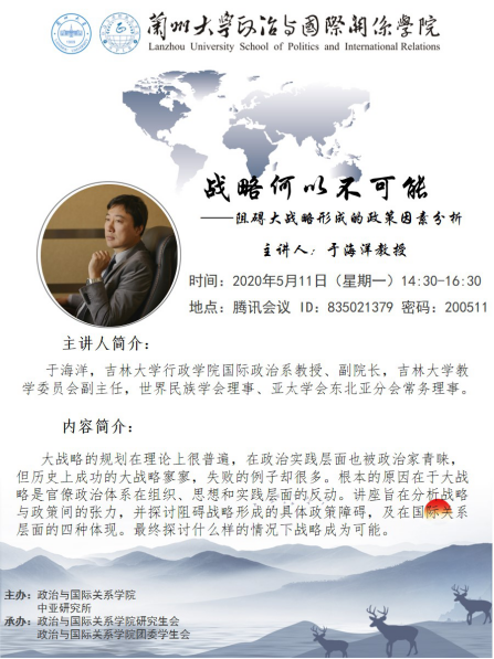 Invited by the School of Politics and International Relations of Lanzhou University and the Institute for Central Asian Studies of Lanzhou University,Professor Yu Haiyang from the School of Public Administration at Jilin University will give an online academic lecture to the teachers and students of the school.