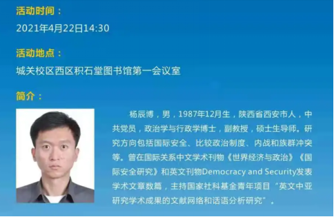 Speaker: Yang Chenbo, Associate Professor, Master Supervisor. He isPh. D. in Government and Public Administration, Chinese University of Hong Kong. His research interests involve international security, civil war, ethnic conflicts,and Diffusion of Armed Civil Conflicts.