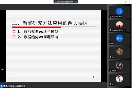 Then, Professor Qi Haixia pointed out that there are two major misconceptions in the application of current research methods. Researchers should choose an appropriate model based on the background and premises, determine the research question and then go forward and reason, and think about how to make hypotheses and develop arguments. At the same time, researchers also need to pay attention to research design, and do a good job of designing the research in terms of question formulation, variable control, hypothesis formulation and case selection or data modelling.