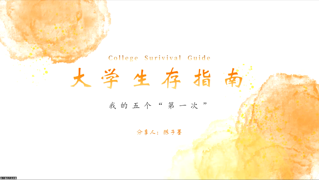The next person to share is Chen Zimo, an excellent student representative who has won national scholarship. She shared the theme of college survival guide, and summed up her learning and life experience from her five first presentations in Lanzhou University. First of all, she told everyone from her first interview experience that they should not be discouraged, but should go to the mountain and sea with enthusiasm. Then, taking her first debate as an example, Chen Zimo stressed that everyone should have the courage to face unknown things from different angles. After that, she drew the conclusion that only when she had the courage to take the first step can there be little progress after the analysis of her first time to participate in Model United Nations. Then, she shared her first event planning experience, revealing the hardships of the event planning process, and hoped that everyone could be more tolerant and understanding to the students who participated in the event planning. Finally, Chen Zimo introduced the process of her first English speech, encouraging everyone to express themselves bravely and face challenges with confidence. In the conclusion, Chen Zimo told everyone to be humble and expected everyone to be able to do "but do good things, don't ask about the future" in college life.