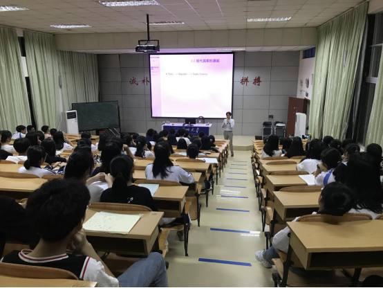 副教授陈一一做了题为“政治学中的国家概念及其发展”讲座,从国家的含义和类型、国家的形式、国家机构三个角度进行了系统讲述。在讲座中,同学们热情高涨,积极参与互动,展现了当代中学生丰富的知识积累以及自信的精神风貌。讲座后,同学们纷纷向陈一一副教授请教关于国家类型、国家机构设立原则以及现实世界中的国家问题等方面的内容,展现了当代中学生关心国家建设、立志报效祖国的主人翁精神。