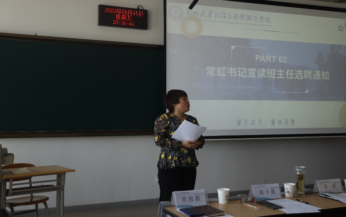会始,贾海燕副书记带领大家奏唱国歌。国歌唱毕后,常虹书记代表学院党委宣读2023级班主任、副班主任的聘任通知,聘任李泽博士担任2023级政治学类一班班主任、刘倩博士担任2023级政治学类二班班主任,聘任杨婷担任2023级政治学类一班副班主任、李伟杰担任2023级政治学类二班副班主任,聘任周长鲜副教授担任2023级研究生班主任。