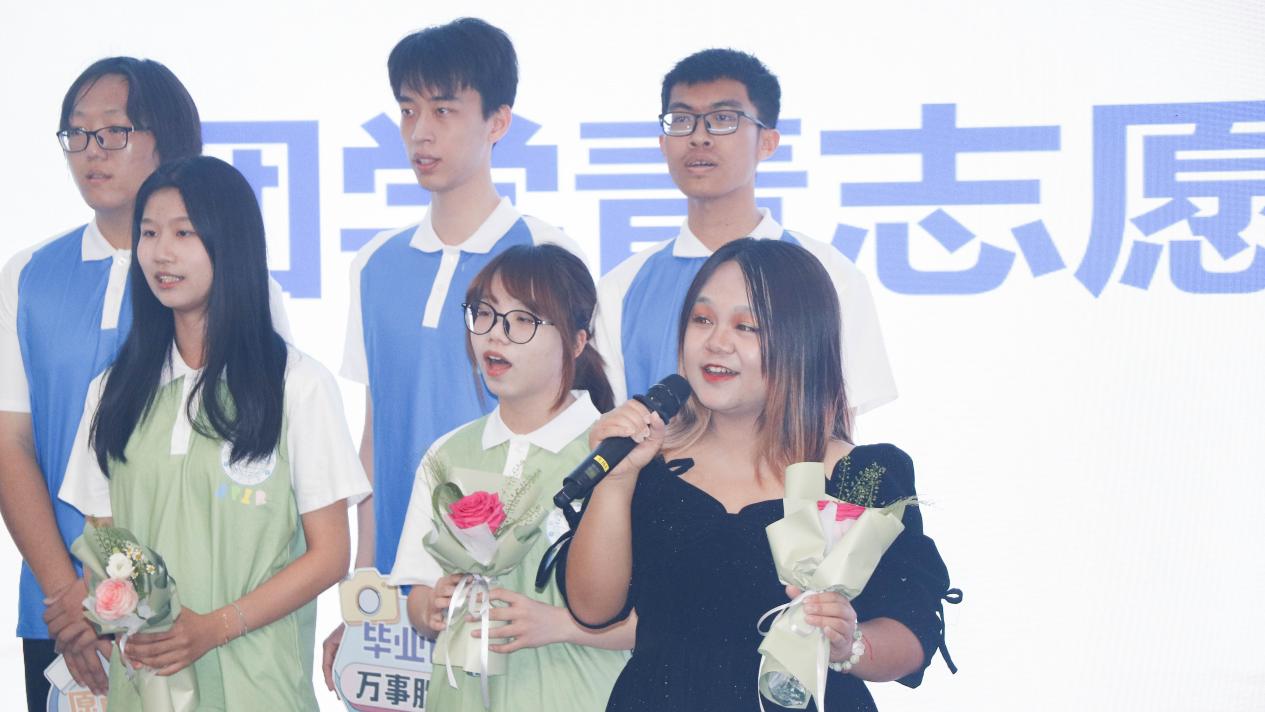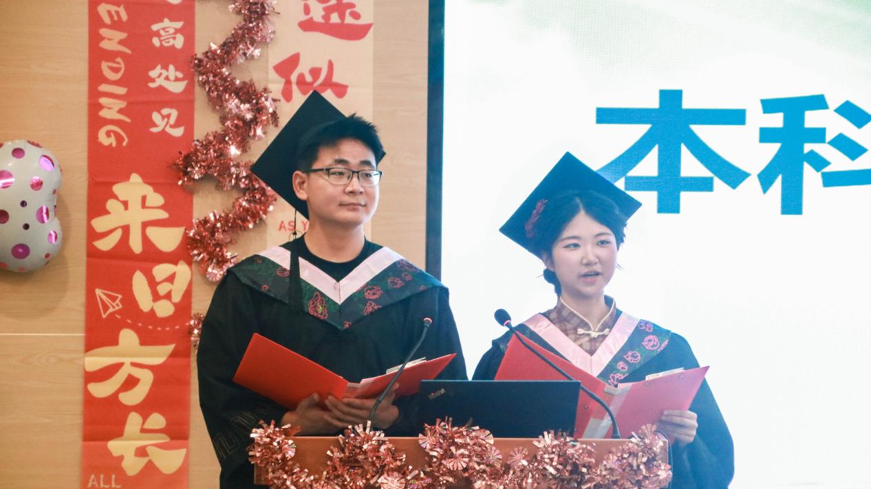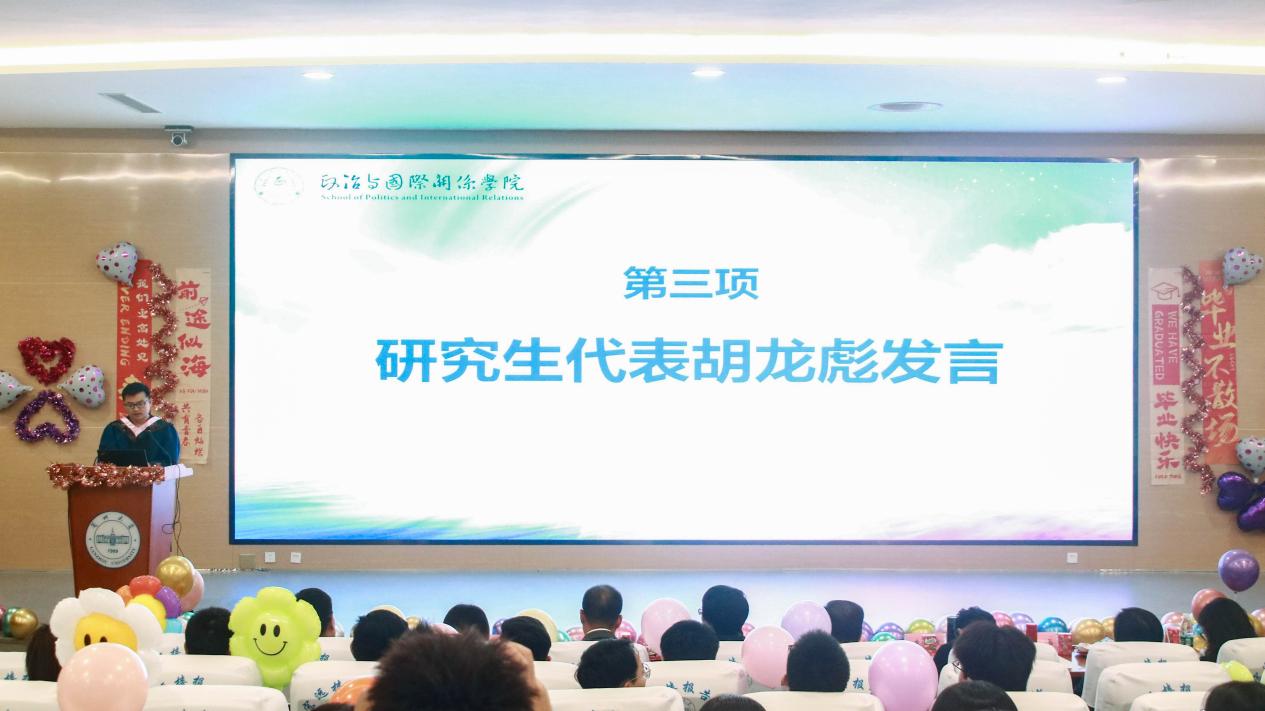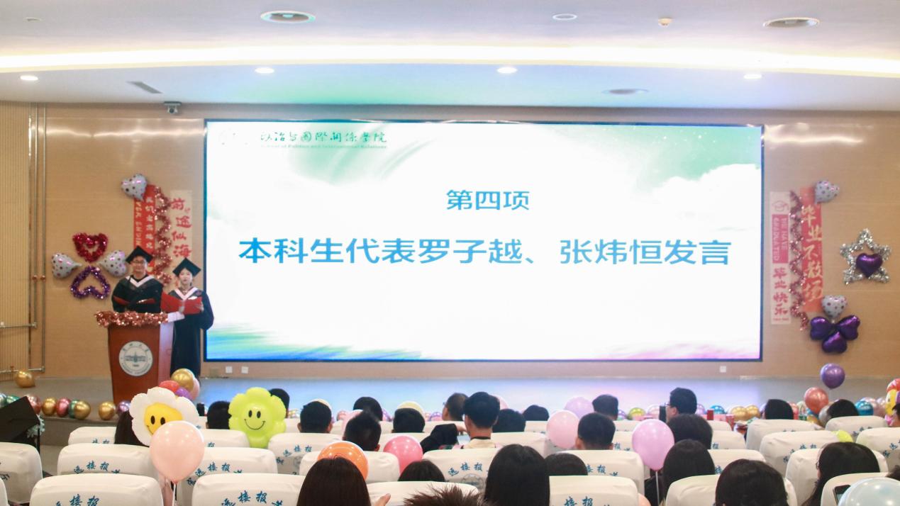 活动第四项,本科生代表罗子越、张炜恒发言。站在本科毕业这一重要的人生节点,他们满怀深情地为在场师生送上诚挚的祝福。张炜恒感慨四年时光匆匆,回顾专业学习中理论、历史与现实交织的深刻体会;罗子越则代表同学们由衷感谢学院领导与老师的悉心教导,以及同窗间真挚的友谊。两位毕业生代表共同展望未来,呼吁同学们永葆求知之心、坚守理性光芒、怀揣家国情怀,勇担时代使命。无论未来走向何方,都应心系祖国,努力为社会进步贡献力量。发言最后,他们向母校、学院领导老师以及家长亲友致以崇高敬意和衷心感谢,祝愿所有毕业生前程似锦,未来可期。